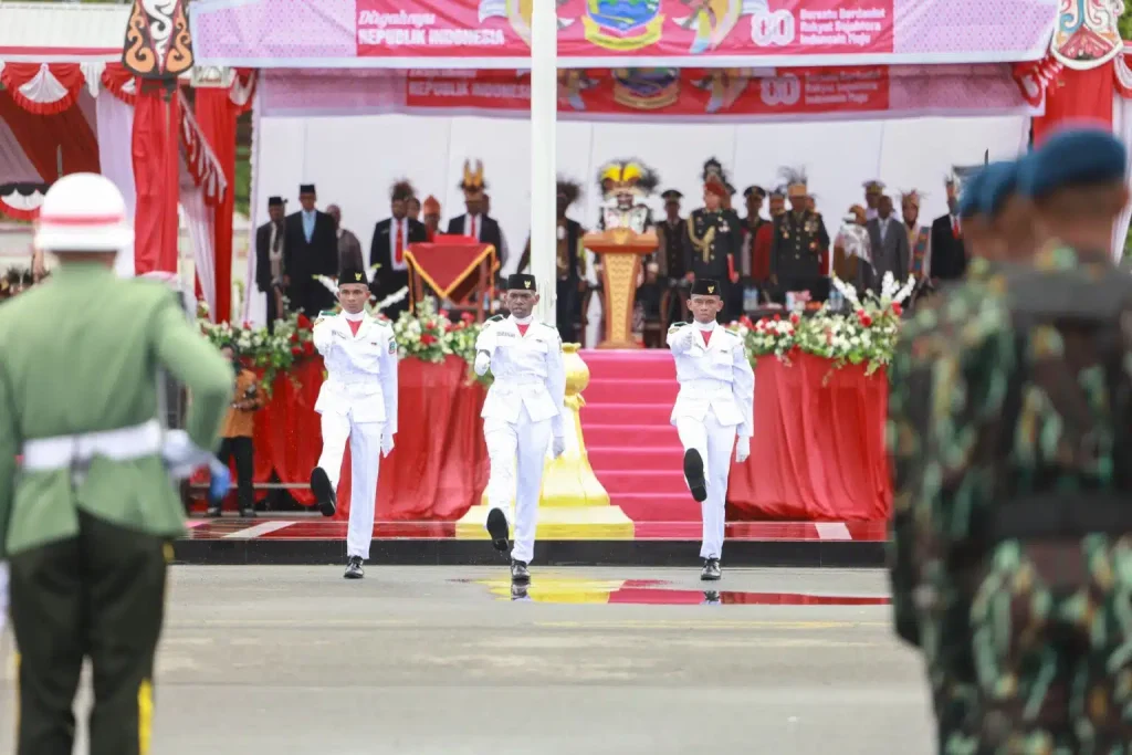 Gubernur Meki Nawipa dalam amanatnya, menegaskan bahwa peringatan HUT Kemerdekaan RI merupakan momen refleksi bagi seluruh masyarakat untuk memperkokoh rasa cinta tanah air, disiplin, tanggung jawab, serta menjaga persatuan dan keberagaman bangsa Indonesia.